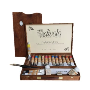 COMPLETE WOODEN BOX CM 28 X 42 – BETACRIL 60 ml CONTAINS: – Extra-fine Betacril Acrylic Colors 15 tubes of 60 ml – 1 palette – 2 bottles of acrylic medium – 2 long-handled brushes – 1 pack of charcoal – 1 single bowl