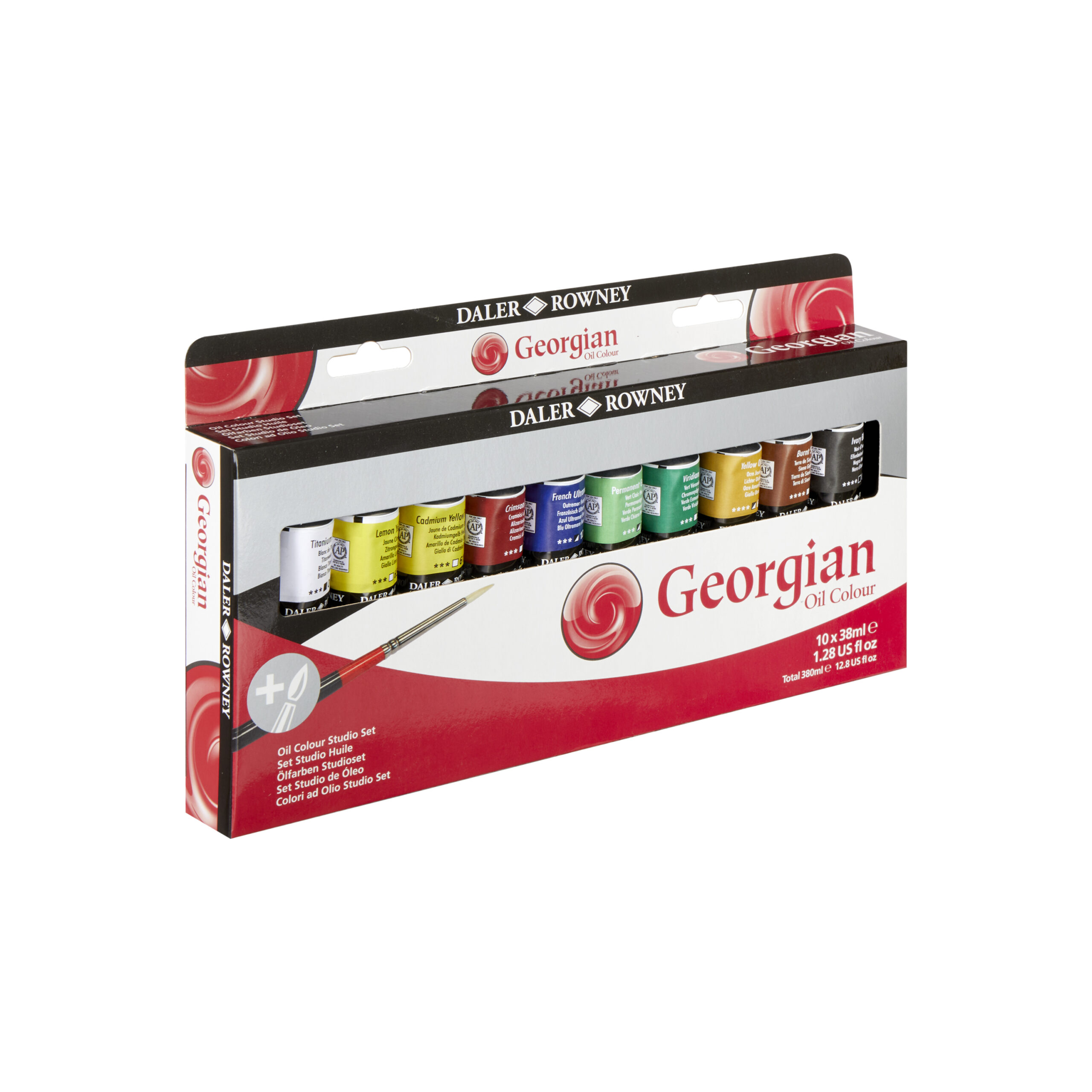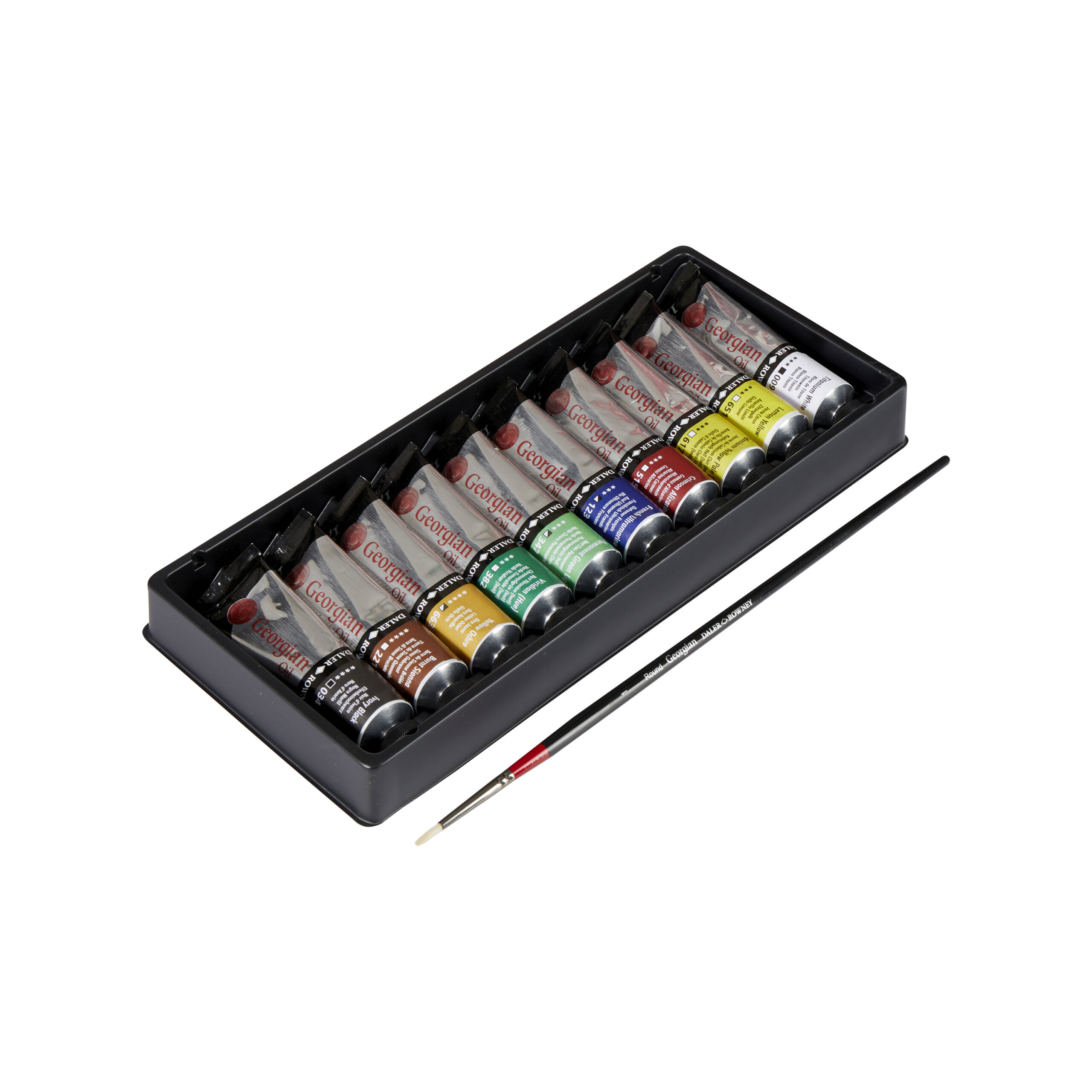 - Contains: Lemon Yellow, Cadmium Yellow Pale Hue, Alizarin Crimson, French Ultramarine, Viridian Hue, Permanent Green Light, Yellow Ochre, Burnt Sienna, Ivory Black, Titanium White and 1 x Georgian Oil Brush. Contents may vary